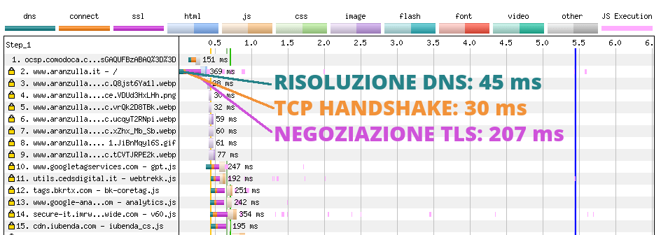 Dal grafico di WebPageTest lo si può notare in quanto la connessione parte in un momento differente rispetto al download della risorsa in sé:
