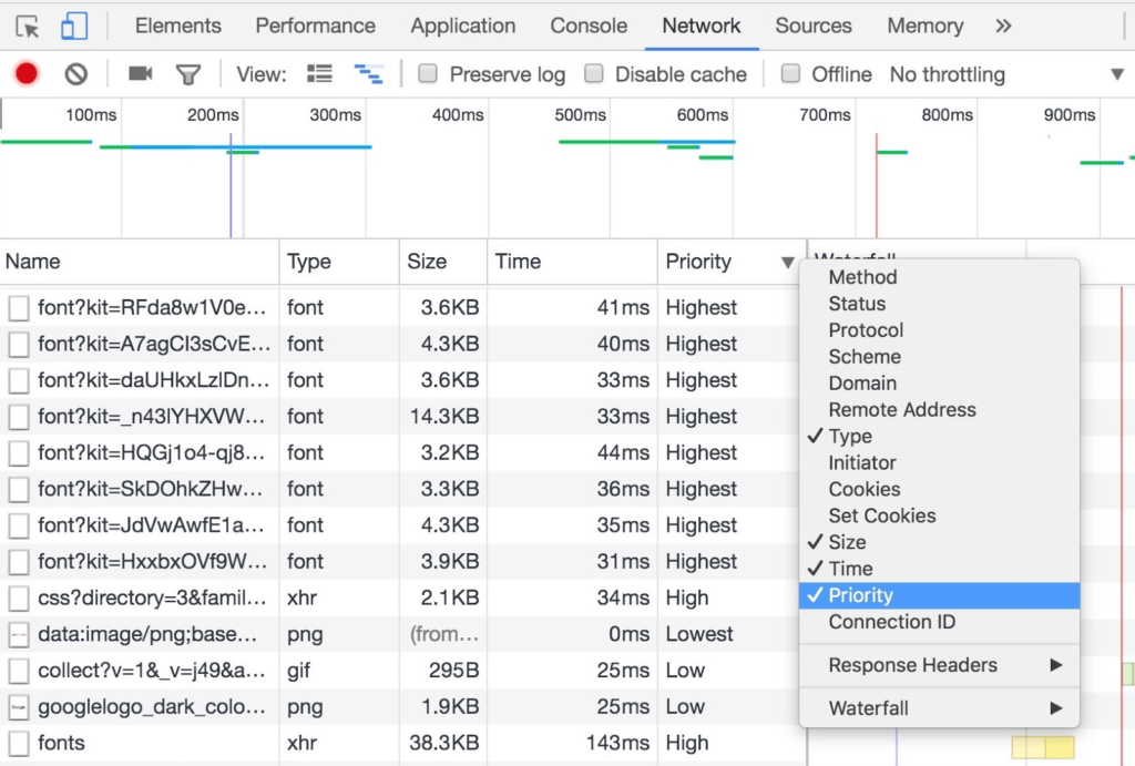 Per visualizzare le priorità dalla DevTools di Google Chrome, cliccare sul tab Network e successivamente con il tasto destro sulle colonne della tabella e spuntare la voce Priority.