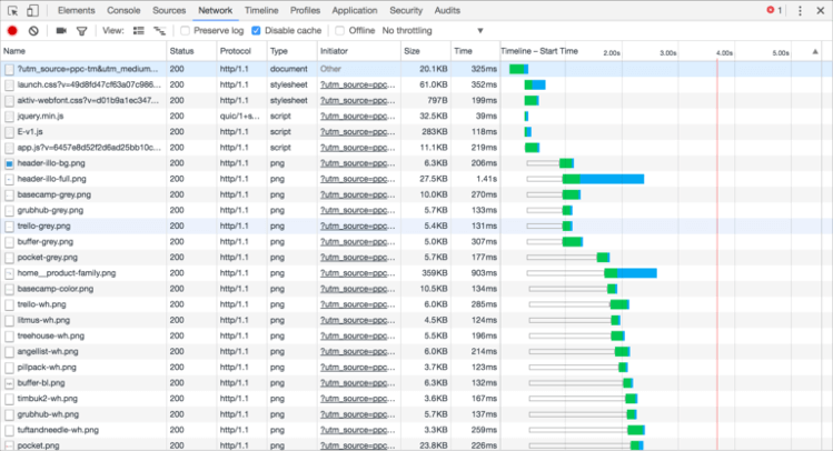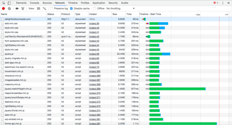 È possibile visualizzare in pratica questo comportamento analizzando il waterfall delle risorse di rete quando si visita un sito web con e senza supporto HTTP 2. Le immagini successive riportano il waterfall di Chrome DevTools dello stesso sito, prima e dopo l’applicazione di HTTP 2. È possibile notare come nel primo caso le risorse vengono scaricate in modalità sequenziale mentre nel secondo caso in parallelo.