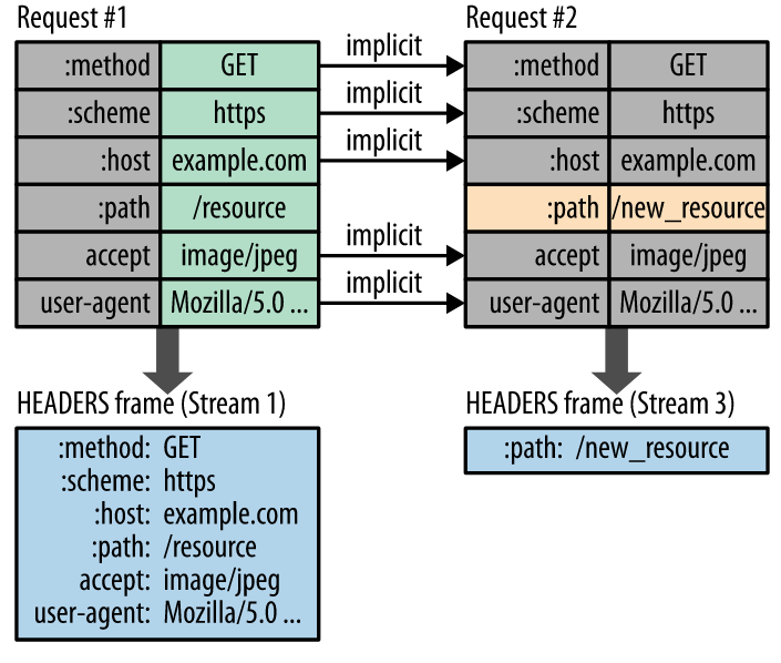 Ogni pacchetto HTTP è composto da header in formato testo che riportano proprietà e caratteristiche della risorsa in fase di trasferimento. Mentre in HTTP/1.1 questi dati vengono sempre trasmessi in chiaro, compreso i cookie con tutto il loro peso, in HTTP/2 vengono compressi utilizzando il formato di compressione HPACK, applicando un algoritmo che consente di rimuovere tutto ciò che è duplicato, ottenendo header più snelli.