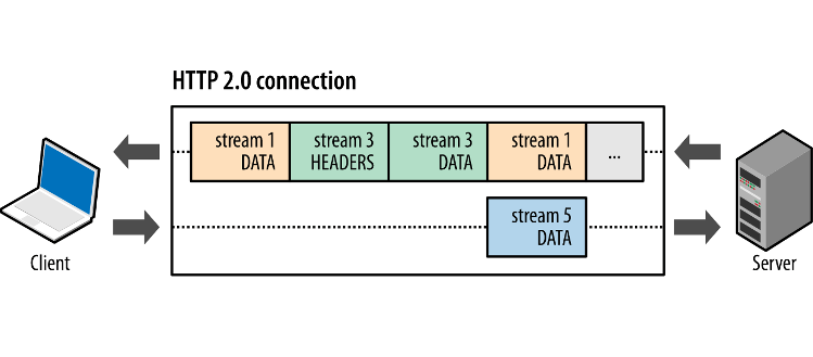 Questo consente al client di scaricare in parallelo le risorse necessarie per effettuare il rendering della pagina. Com’è possibile notare dalla figura sottostante, infatti, mentre il client invia al server uno stream identificato dell’ID 5 il server invia al client gli stream 1 e 3 ad intervalli diversi, facenti capo a risorse diverse.