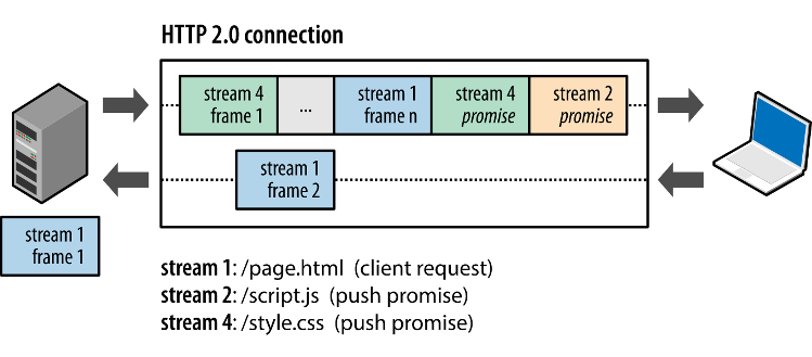 A differenza di HTTP/1.1, tutte le comunicazioni in HTTP/2 vengono effettuate mediante l’ausilio di un’unica connessione TCP. Gli header che compongono il pacchetto HTTP vengono suddivisi in frame codificati in binario che a loro volta vengono raggruppati in messaggi che appartengono a stream ben precisi, i quali vengono trasmessi mediante la connessione TCP aperta.
