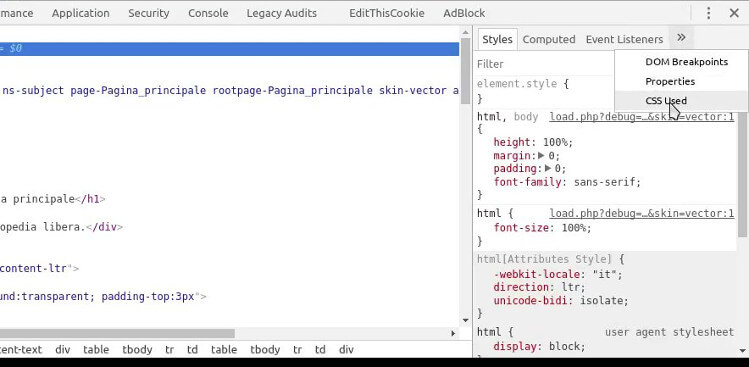 Per identificare la quantità di regole CSS inutilizzate da una specifica pagina web occorre aprire la DevTools di Google Chrome e cliccare sul tab Legacy Audits.
